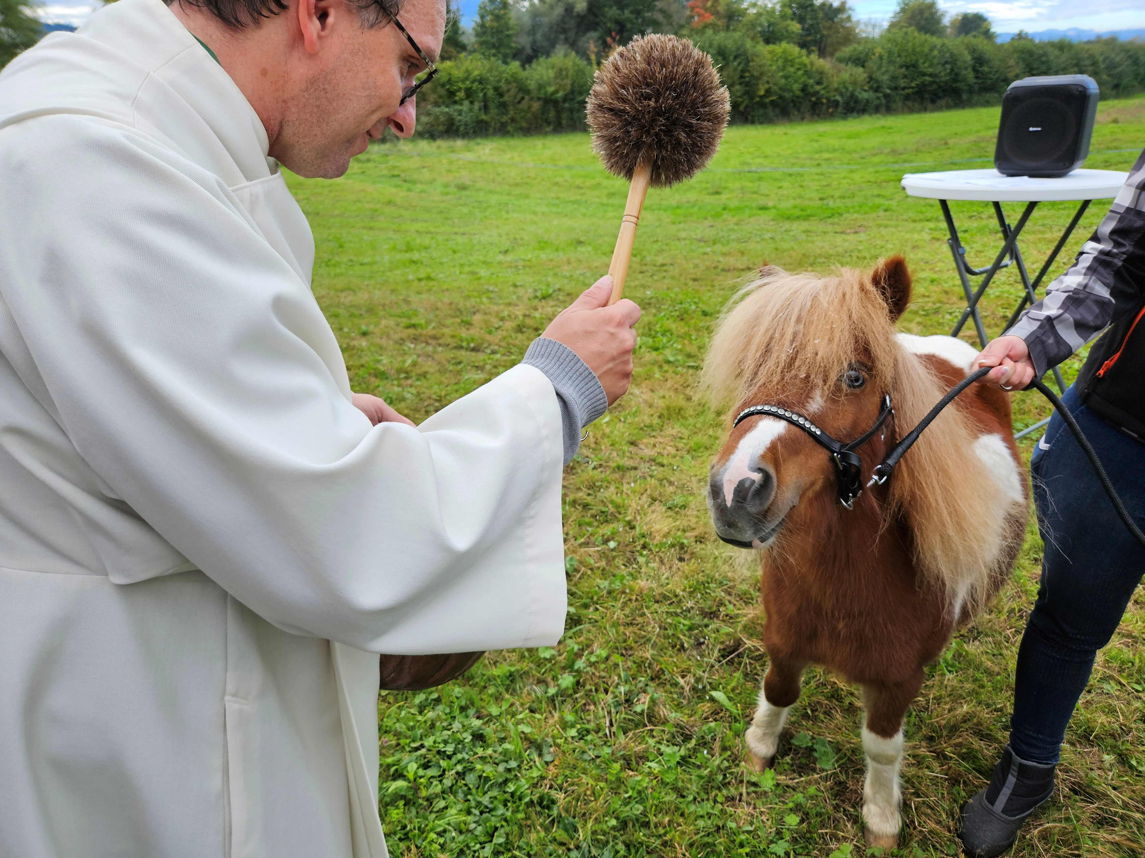 Nach feierlichen Worten von Stefan Küttel wurden die anwesenden Tiere – darunter Pferde, Pony's, Hund und Katzen – einzeln gesegnet.