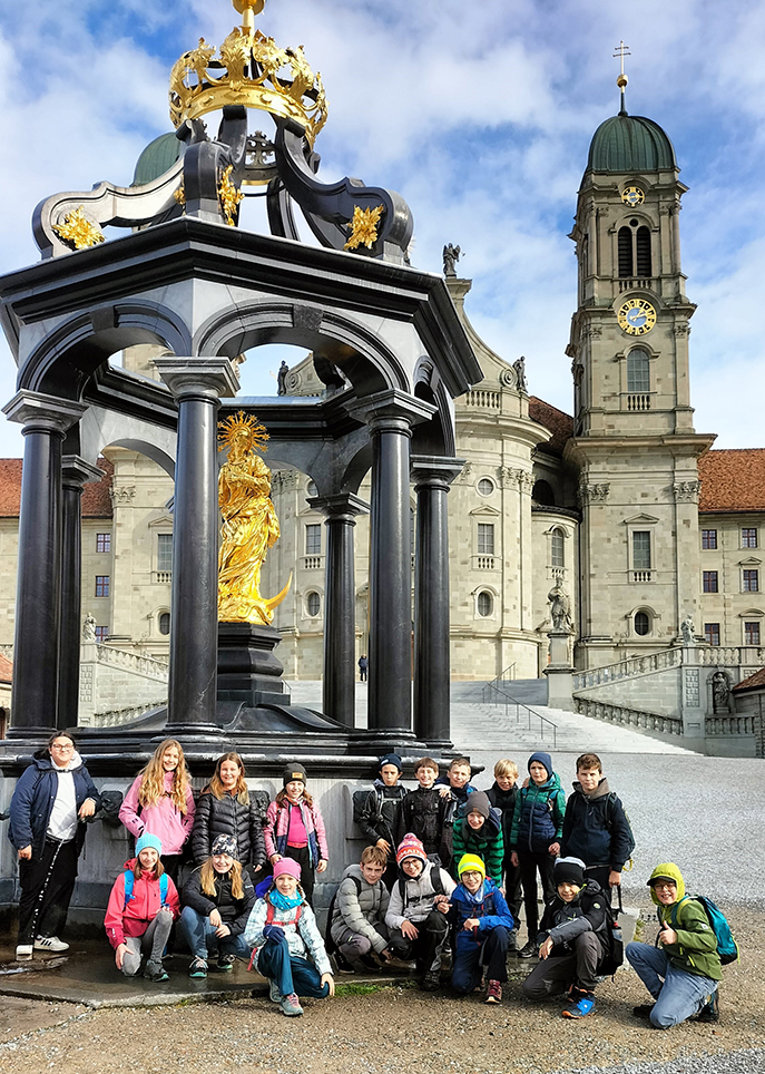 Nach einer kurzen Ruhepause empfing uns Frau Kälin und zeigte uns zuerst einige Räume des Benediktiner-Klosters, wo die Mönche ihre Gastzimmer und Säle haben. Auch die Geschichte des Klosters und der schwarzen Madonna wurde von ihr anschaulich erklärt. Dann endlich führte sie uns in die prachtvolle, imposante Klosterkirche. Viel Interessantes erfuhren die Kinder… z.B. dass es in der Kirche rund 1000 Engel hat (gemalen und als Skulptur), wo die Mönche begraben werden. Zum Abschluss sassen alle still vor der Gnadenkapelle der schwarzen Madonna. Als wir nach der Besichtigung aus der Kirche kamen, regnete es...