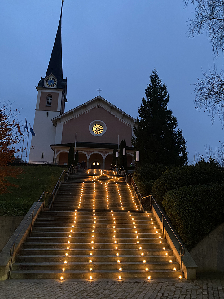 Dann wurde jedes mit einer Kerze bestückt und endlich angezündet. Von 17.00 bis 19.00 Uhr durften die Besucher/-innen den Lichterzauber auf der Kirchentreppe und auf dem Kirchenplatz bewundern und wurden mit feinem Kuchen und heissem Punsch verwöhnt. Danke den vielen Helfer/-innen und den Besuchern. Es war lichtvoll und herzerwärmend, mit welcher Begeisterung alle dabei waren.
