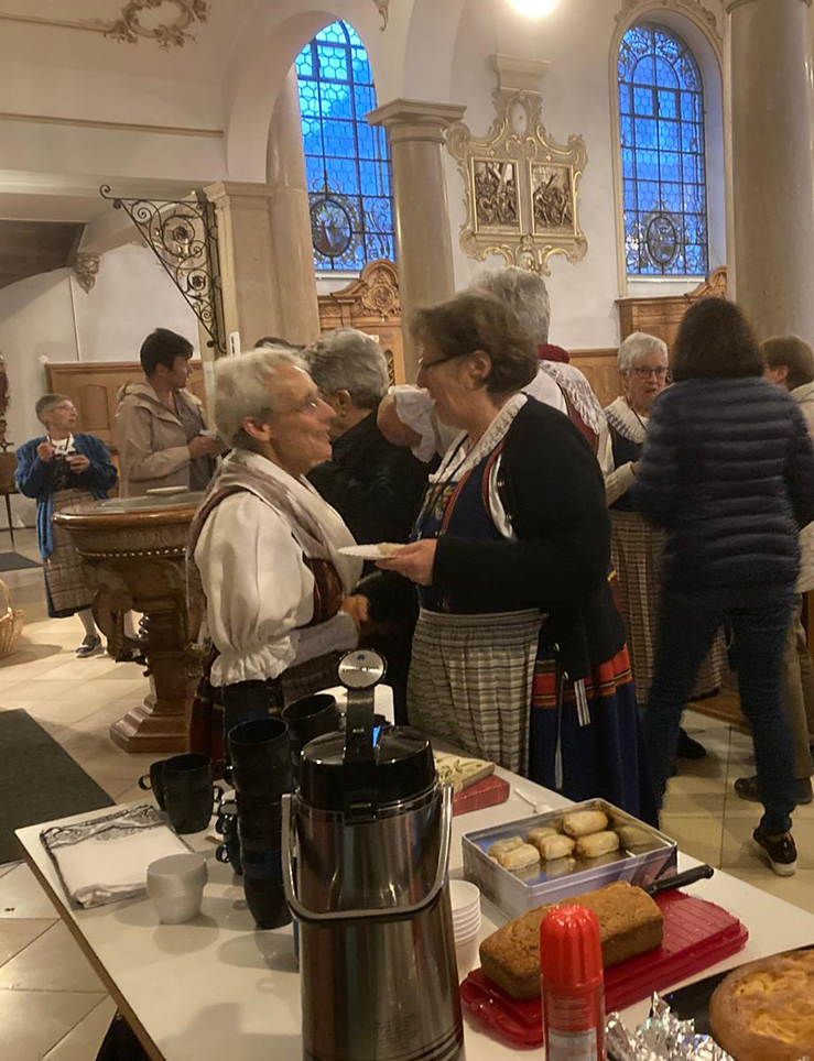'Stille werden – in der Stille bleiben wie Maria war der Grundgedanke dieser Feier. Christina Oehen Tanner dirigierte den Trachtenchor und da wurde auch auf piano und forte geachtet. Der herrliche Klang der beiden Alphörner, gespielt von Vreni Herger und Bruno Stadelmann, erfüllte den ganzen Kirchenraum. Die wohltuenden, ruhigen Momente in dieser Andacht waren dann auch ein Thema in den Gesprächen und dem Austausch, das bei Kaffee, Tee und Kuchen angesprochen und verdankt wurde. Ein grosses Dankeschön auch an alle Teilnehmer:innen, die sich trotz des Wetters auf den Weg in die Kirche gemacht haben.