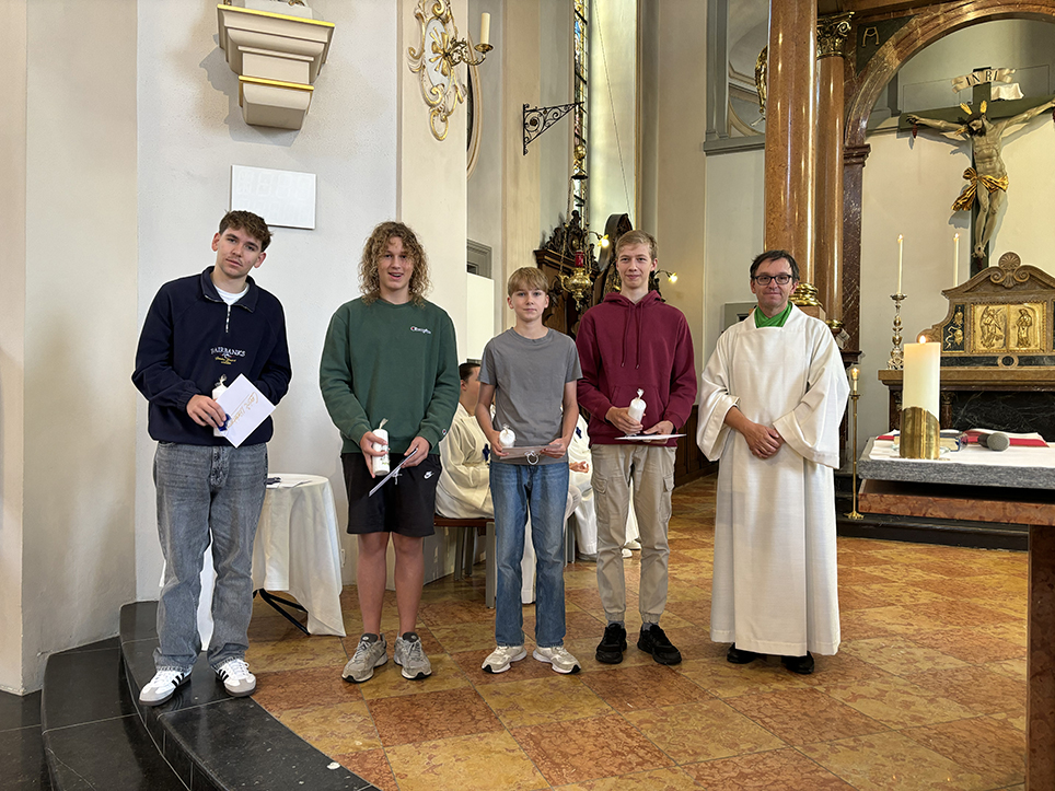 Paula-Marie und Elias Dorenkamp, Lucas Mühlebach, Joya Waldispühl, Cedric Niederberger, Laurent Felder, Levin Wachter und Nik Lustenberger. Diese Jugendlichen haben über mehrere Jahre im Ministrantendienst unsere Gottesdienste begleitet und mitgestaltet. In schönen wie traurigen Momenten waren sie da um den Menschen zu dienen und stellten so ihre Zeit im Tun zur Verfügung. Ihnen allen ein grosses Dankeschön und für ihre Zukunft alles Gute. Felizitas Herrmann durfte den Abtretenden ihr Kreuz, dass sie während ihrer Ministrantenzeit begleitete mitgeben, zusammen mit einer Kerze, die sich auf ihrem Weg begleiten soll.