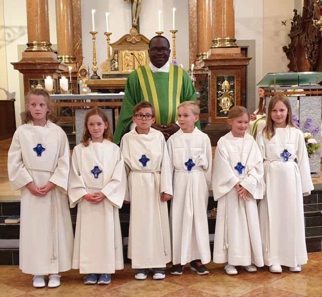 Sechs neuen Ministranten haben sich für die Pfarrkirche entschieden, während drei sich für die Klosterkirche eingeschrieben haben. Im Gottesdienst, hatten sechs neuen Ministranten mit ihren Familien teilgenommen. Sie vertraten so auch die anderen drei, die verhindert waren. Im Gottesdienst beteten wir dafür, dass Gott ihnen Freude, innere Erfüllung und äusseren Erfolg schenke. Als Zeichen der Aufnahme in ihren Dienst bekamen alle ein Kreuz, das Zeichen unseres Herrn Jesus Christus und das Symbol unserer Hoffnung. Wir wünschen allen neuen Ministranten von Herzen Gottes Segen viel Freude am Dienen.
