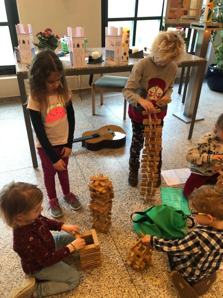 Mit Kappla-Hölzchen ging es im Turmbau hoch hinaus und die Kinder bastelten aus Papier einen Turm. In der Geschichte „Turmbau zu Babel“ bauen die Menschen einen Turm, der bis in den Himmel reicht und mächtiger sein sollte als Gott. Diesem gefiel das nicht und er gab den Menschen verschiedene Sprachen, damit sie nicht mehr miteinander sprechen konnten. Die Menschen wussten wieder, nichts ist mächtiger als Gott. Passend zur Geschichte sangen die Kinder im Chinderfiir-Team ein Lied, in dem in verschiedenen Sprachen „Grüezi“ gesungen wird.
