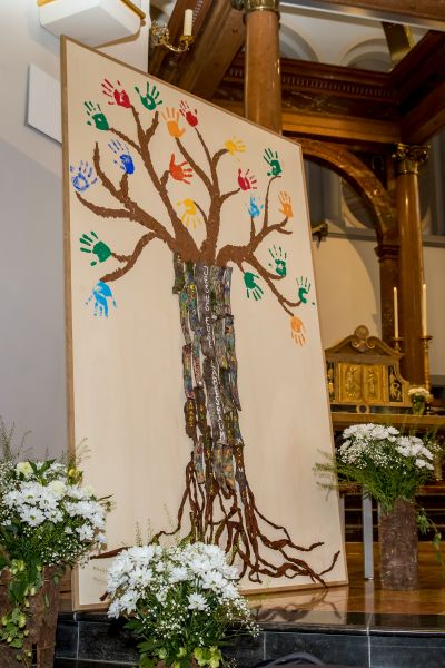 Diese Gedanken kreativ umgesetzt in einem grossen Bild und einer Wurzel zierten den Altarraum. Die Kommunionkinder und ihre Familien haben in den verschiedenen Feiern der Vorbereitungszeit daran mitgestaltet. Wie wohltuend ein Bild aus der Natur für unser eigenes Leben sein kann, haben in diesem Jahr die Kommunionkinder ganz besonders erfahren. Die von einer Väter-Gruppe hergestellten Kreuze aus gesammeltem Schwemmholz erinnert die Kinder an die Zeit des geduldigen Wartens auf das «weggeschwemmte» Fest vom Frühling…
