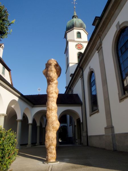 Zeichen eines langen Lebens, bearbeitet und eingelassen als Wegzeichen des Versöhnungsweges der Pfarrei Eschenbach. Entdeckt und hergerichtet von Künstler Franz Hobi aus Zug. Als zweite Station des Versöhnungsweges soll er die Wolkensäule symbolisieren, die das Volk von Israel aus der Wüste führte bei Tag und in der Nacht war es eine Feuersäule. Nähere Beschreibung siehe «Eine Einladung Versöhnungsweg», das Buch dazu.