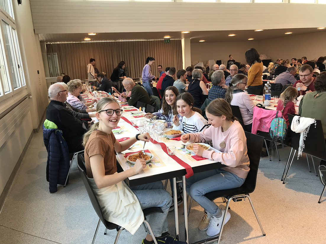 Die schon rekrutierte Crew für das Jahr 2020 hatte zum grössten Teil wieder zugesagt. So stand am Sonntag 20. März ab 11.00 Uhr alles bereit um Jung und Alt mit feinen Spaghetti zu verwöhnen. Die Anspannung stieg, kommt jemand? Können wir an vergangene Jahre anknüpfen? Alle waren gespannt. Tatsächlich nach der Feier in der Kirche und der Chinderfiir im Pfarrhaus kamen die Besucher. Die Reihen füllten sich, Spaghetti wurden bestellt und man ass, trank und plauderte wieder miteinander.