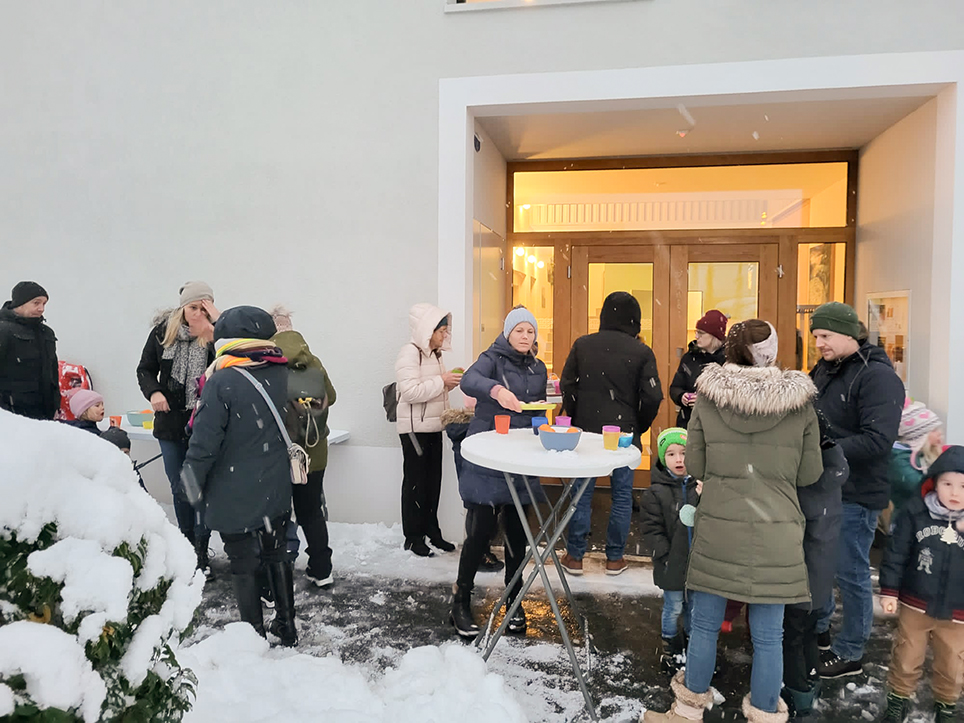 Leise, weihnächtliche Musik hat die kleinen und grossen BesucherInnen beim Eintritt in die Kirche auf die bevorstehende Feier eingestimmt. Nach einer kurzen Begrüssung, wurde das allseits bekannte „Hey hey hey“ gesungen, welches zu jeder Chinderfiir gehört. Zu den wichtigen Adventstraditionen gehört auch das alljährliche Anzünden der ersten Kerze am Adventskranz, dieses Mal von Pablo. Die diesjährige Geschichte handelte von einem sehr kleinen Tannenbaum, der traurig und alleine auf einem Hügel stand. Seine Brüder wurden fürs Weihnachtsfest in die Stadt abgeholt und er blieb alleine und traurig zurück, weil er zu klein war. Als die Sterne, die Schneedecke des Tannenbaums zum Glänzen brachte und seine Freunde ihm viele schöne Lieder sangen, fühlte er sich schon viel besser. Am Heiligabend sprach das Jesuskind zu ihm: „Du bist nicht zu klein für Weihnachten, ich bin ebenso klein wie du.“ Seither hatte sich der kleine Tannenbaum nie mehr zu klein gefühlt. Denn, so das Fazit der Geschichte, es ist niemand zu klein, um grossartig zu sein. Beim anschliessenden Apéro, im Schnee vor dem Candidus hatten vor allem die Kinder ihren Plausch, während sich die Grossen bei einem Glühwein oder Punsch wärmten.