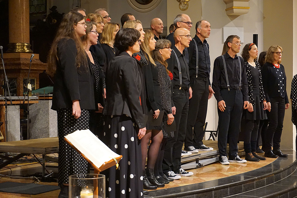 Die gewählte Musikplattform, offen für ganz unterschiedliche Stilrichtungen wie traditionelle Chöre, Vokalensembles, aber auch für Kirchenräume eher ungewöhnliche Formationen, hat sich gelohnt: Immer wieder Standing Ovations als Reaktion des Publikums auf die berührenden Darbietungen. So etwa hat sich der No Name Chor (s. Bild) mit dem Walliser Lied ,“So easy, wenn düü da bisch,“ in die Herzen des Publikums gesungen.
