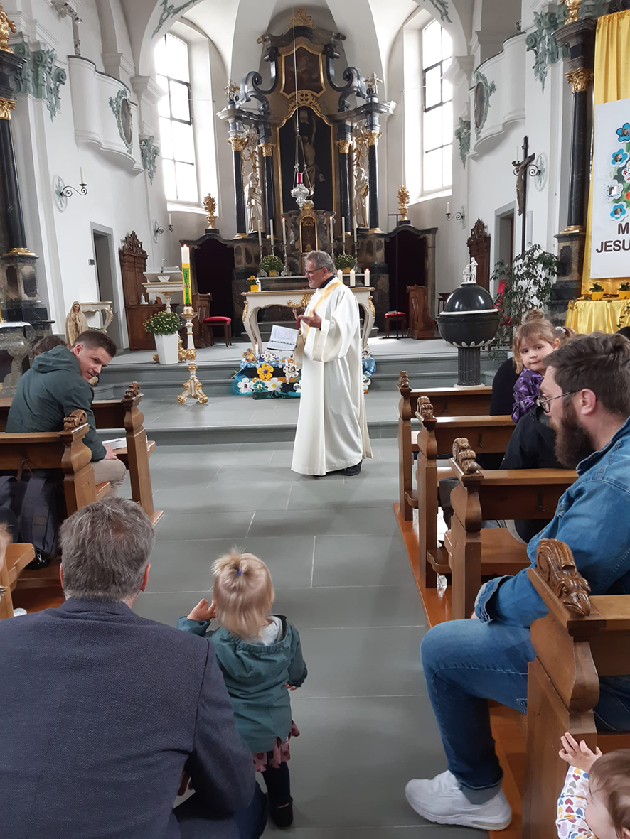Eltern, Paten, Grosseltern, Geschwister – eine bunte und lebendige Schar füllte die Kirchenbänke. Die Taufblüten wurden vom Baum genommen und nochmals wurden die Namen der getauften Kinder erwähnt und die Taufkerzen entzündet. Seppi Hodel erzählte mit Bildern die Geschichte, wo Jesus sich Zeit für die Kinder nahm und die Kinder segnete. Nachher lud das schöne Wetter zum Apéro vor dem Candidus ein. Herzlichen Dank dem Pfarreirat, der den Apéro servierte.