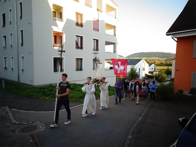 Die Freude war gross, dass wir in Inwil eine Muttergottesprozession halten durften. Wir waren zahlreiche Gläubige, die mit Pfarrer Polycarp und zwei Ministranten vom Wegkreuz südlich vom Zentrum Möösli in die Kirche pilgerten. Für eine festliche Gestaltung wurden alle Register gezogen. Dazu halfen die mit Blumen geschmückte Muttergottesstatue, die stimmgewaltigen Sänger, und nicht zuletzt das prächtige Herbstwetter. Herr Pfarrer Polycarp spendete uns in der Kirche nach der Aussetzung des Allerheiligsten und dem Weihegebet an die Muttergottes den sakramentalen Segen mit der schönen Monstranz.