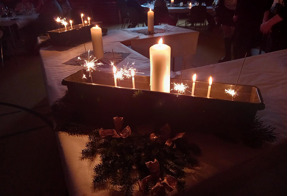 Die Feier stand im Zeichen des Themas «Wunderlicht», welches das Team Frohes Alter unter der Leitung von Sandra Koch mit Renate Achermann, Astrid Krummenacher-Slamanig und Edith Slamanig auf vielfältige Weise und mit grosser Liebe zum Detail in Szene gesetzt hat. Angefangen bei der wunderschönen Dekoration im Saal und auf den Tischen, über den blau-silbrig schimmernden Fisch in der Fortsetzungsgeschichte bis zu den liebevoll verpackten, vom leitenden Priester Polycarp gesegneten Schachtelchen mit einem lichtvollen Wunderstern als Weihnachtszeitbegleiter. Die mehrteilige berührende Erzählung wurde durch Darstellerinnen und mit verschiedenen Requisiten untermalt. Alle Anwesenden entzündeten als Symbol für ihren Weihnachtswunsch je eine Kerze und platzierten diese in Gefässen in der Saalmitte. Dies führte zu einem lichtvollen und energiegeladenen Hingucker. Neben dem Auftritt eines Panflötentrios setzte Claire Brunner am Klavier immer wieder feinfühlig musikalische Akzente. Auch wurden ab und zu gemeinsam vertraute Weihnachtslieder gesungen. Nach dem Tischgebet von Pastoralraumleiter Stefan Küttel wurden mit dem kulinarischen Teil weitere Wunderlichtakzente gesetzt. Die feine Bowle, der abwechslungsreiche Apéroteller, die nahrhafte Rüeblisuppe, der feine Hauptgang und das Dessert in Wunderlicht-Kerzenform schmeckte allen vorzüglich und wurde sichtlich genossen.