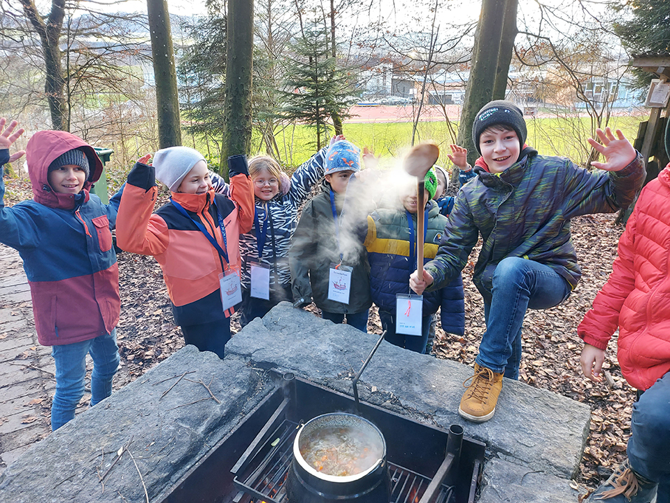 Im ersten Atelier «Wasser» durften die Kinder ein Fläschchen mit einer selbst gestalteten Etikette verzieren, die Hand abzeichnen und am Fläschchen anbringen. Die Botschaft lautete: «jeder kann segnen. Ich kann Wasser zum Segnen brauchen, kann aber auch einfach mit der Hand segnen. Für was wir das Fläschchen brauchten, blieb noch ein Rätsel. Im zweiten Atelier wurden Perlenherzen gebastelt mit der Botschaft: «Segnen heisst, mit ganzem Herzen und Gottes Kraft jemandem nur das Beste wünschen.» Beim dritten Atelier, bei der Grillstelle im Wald, bereiteten die Kinder eine Gemüsesuppe zu. Die Botschaft war: «Danke sagen für den Segen der Vielfalt, welche uns die Erde gibt.» Nun waren die Rätsel beinahe gelöst und als Belohnung gab es zum Zvieri eine feine Gemüsesuppe und Brot.